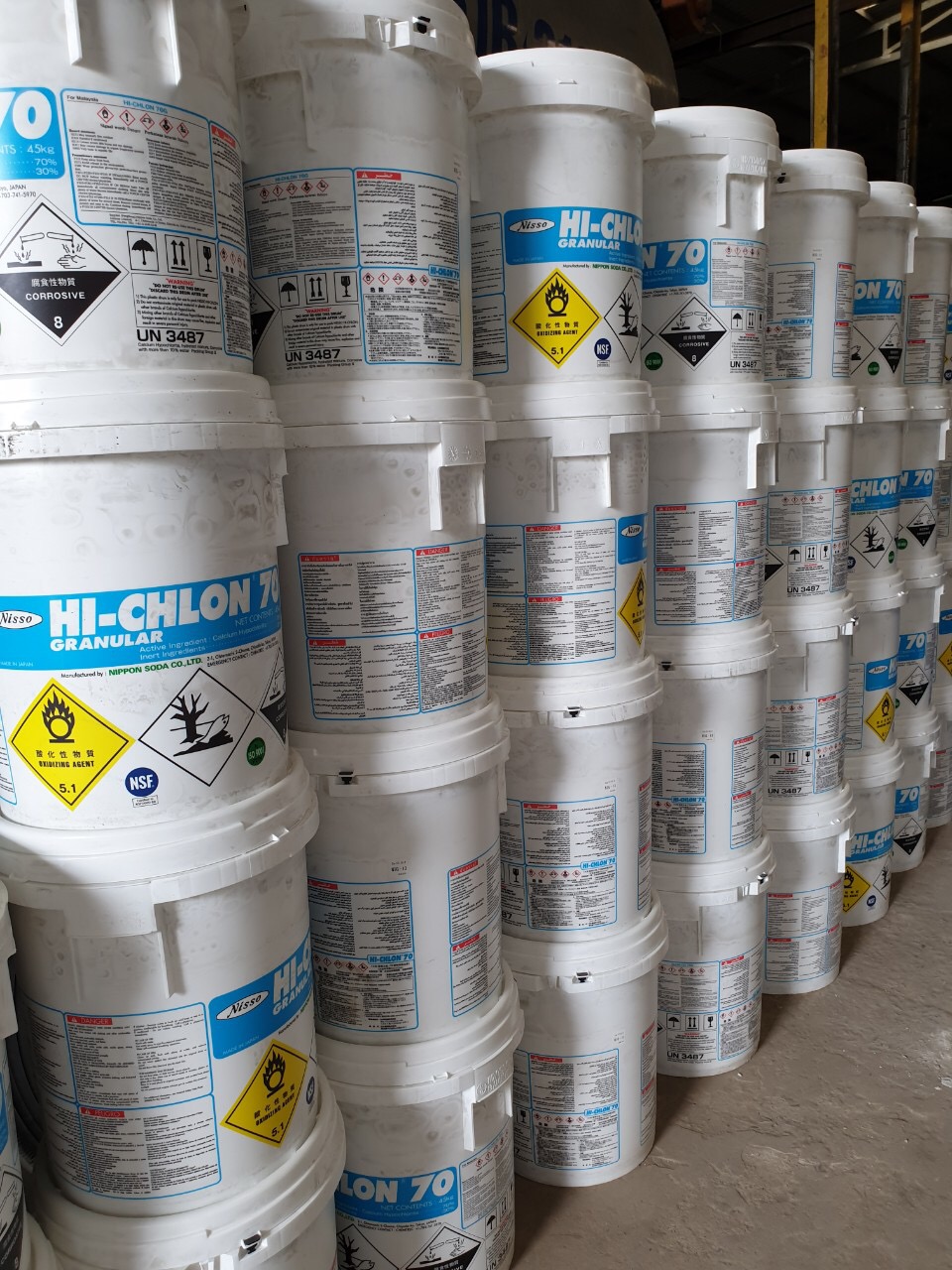 Chlorine Sát Khuẩn – Clorin 70% Nhật Bản Công Thức Hóa Học : Ca(OCl)2 Hàm lượng hóa chất : 70% Xuất xứ : Nhật ( Janpan ) Đóng gói : 45Kg/1thùng Hóa Chất Chlorine Sát Khuẩn – Clorin 70% Nhật Bản dùng để làm gì ? Ngoại quan : Dạng bột hoặc hạt sùng, có mùi nồng hắc, dễ tan với nước. Chlorine Sát Khuẩn tên thường dùng hay còn biết đến với tên gọi khác là Clorin. Đây là hợp chất hóa học có tác dụng oxi hóa và có tính xác khuẩn cực mạnh. Chlorine – Ca(OCl)2 được sử dụng rất nhiều trong cuộc sống hàng ngày và nhiều góc cạnh khác nhau như nghiên cứu khoa học, ứng dụng trong các ngành nghề khác nhau. Chlorine Sát Khuẩn – Clorin trong tự nhiên được tìm thấy dưới dạng bột trắng, bột viên, hoặc tấm phẳng. Chlorine cần được bảo quản tốt nhất trong điều kiện khô mát, tránh xa các chất hữu cơ. Ca(OCl)2 là hợp chất có rất nhiều trong tự nhiên, dễ kiếm và giá thành rẻ. Hợp chất Chlorine là chất không màu, có hiệu quả khử trùng cao với phạm vi rộng các chủng loại khuẩn, hiệu quả trong việc oxy hóa các hợp chất hữu cơ và vô cơ nhất định. Chất này có thể tự tòa nhiệt và phân hủy nhanh chóng đi kèm với việc giải phóng khí clo độc hại.